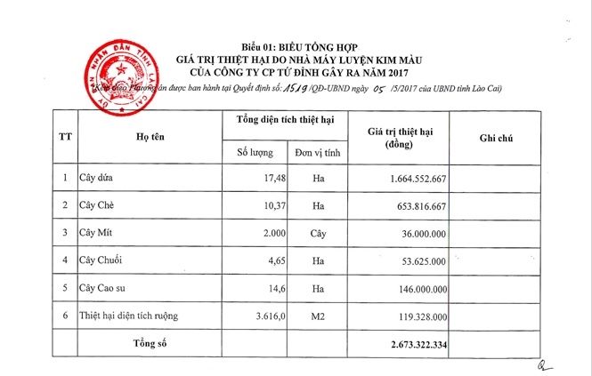 UBND tỉnh Lào Cai vừa ra quyết định phê duyệt phương án hỗ trợ khắc phục thiệt hại hoa màu bị thiệt hại do bị ảnh hưởng ô nhiễm từ nhà máy luyện kim màu Tứ Đỉnh tại xã Bản Lầu, huyện Mường Khương (Lào Cai).