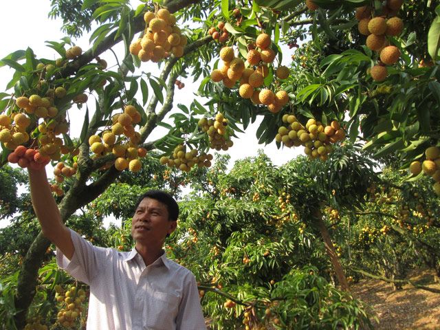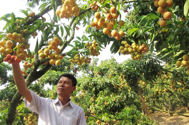 Với giải pháp cho vải thiều ra hoa, đậu quả trên thân, năm nào vườn vải nhà ông Hành cũng được mùa với sản lượng đạt từ 20 – 30 tấn quả, thu về khoảng 500 triệu – 600 triệu đồng/năm. Ảnh: Đức Thọ.