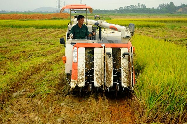Nông dân xã Thanh Phong, huyện Thanh Chương (Nghệ An) thu hoạch lúa xuân. Ảnh: HỮU THỊNH
