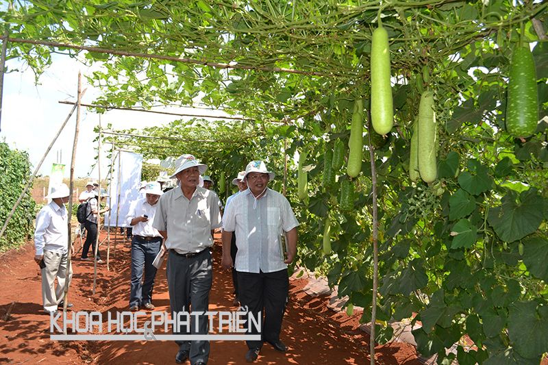 Ông Phạm Văn Sáng (phải) giới thiệu mô hình nông nghiệp công nghệ cao tại Trung tâm Ứng dụng công nghệ sinh học. Ảnh P. Sang