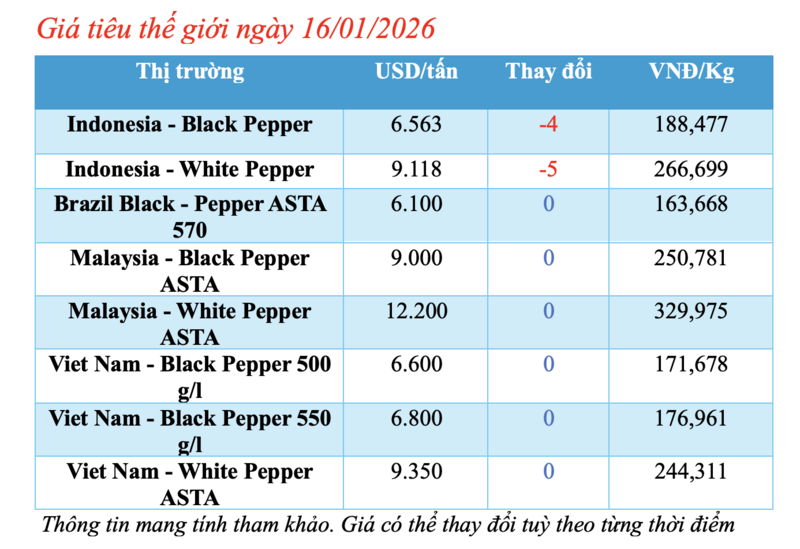 Cập nhật giá tiêu thế giới từ Hiệp hội Hồ tiêu Quốc tế (IPC) sáng 16/01/2026, hồ tiêu xuất khẩu hôm nay ghi nhận phiên sụt giảm tại thị trường Indonesia. Các thị trường còn lại duy trì ổn định so với phiên giao dịch hôm qua.