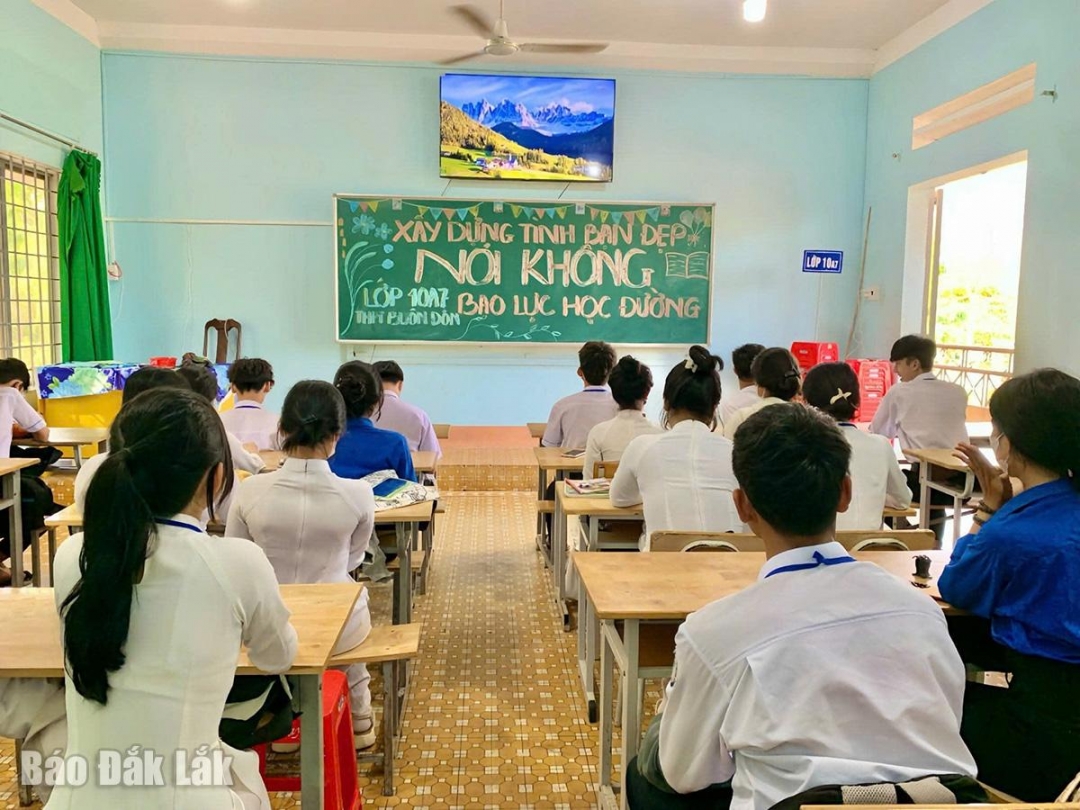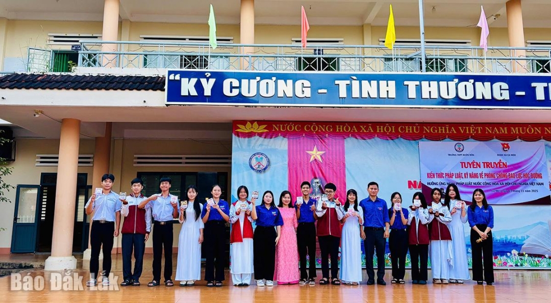 Thầy Trần Vĩnh Trung, Phó hiệu trưởng Trường THPT Buôn Đôn chia sẻ, toàn trường có 985 học sinh, trong đó đồng bào dân tộc thiểu số chiếm khoảng 44,5%. Nắm bắt tâm lý các em trong độ tuổi trưởng thành, nhà trường thường xuyên phối hợp tuyên truyền pháp luật, trang bị cho các em những kỹ năng an toàn trên không gian mạng, công tác phòng, chống ma túy, bạo lực học đường, bảo đảm an toàn giao thông, phòng cháy, chữa cháy… Các hoạt động tuyên truyền được duy trì thường xuyên bằng các chương trình ngoại khóa hoặc lồng ghép trong các buổi sinh hoạt, tiết học, bài giảng. Nhờ vậy, tình trạng mâu thuẫn, vi phạm kỷ luật thông thường ở trường học giảm đáng kể.