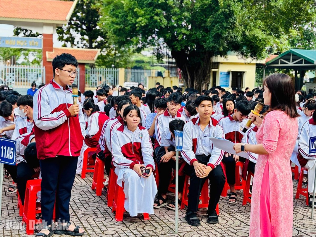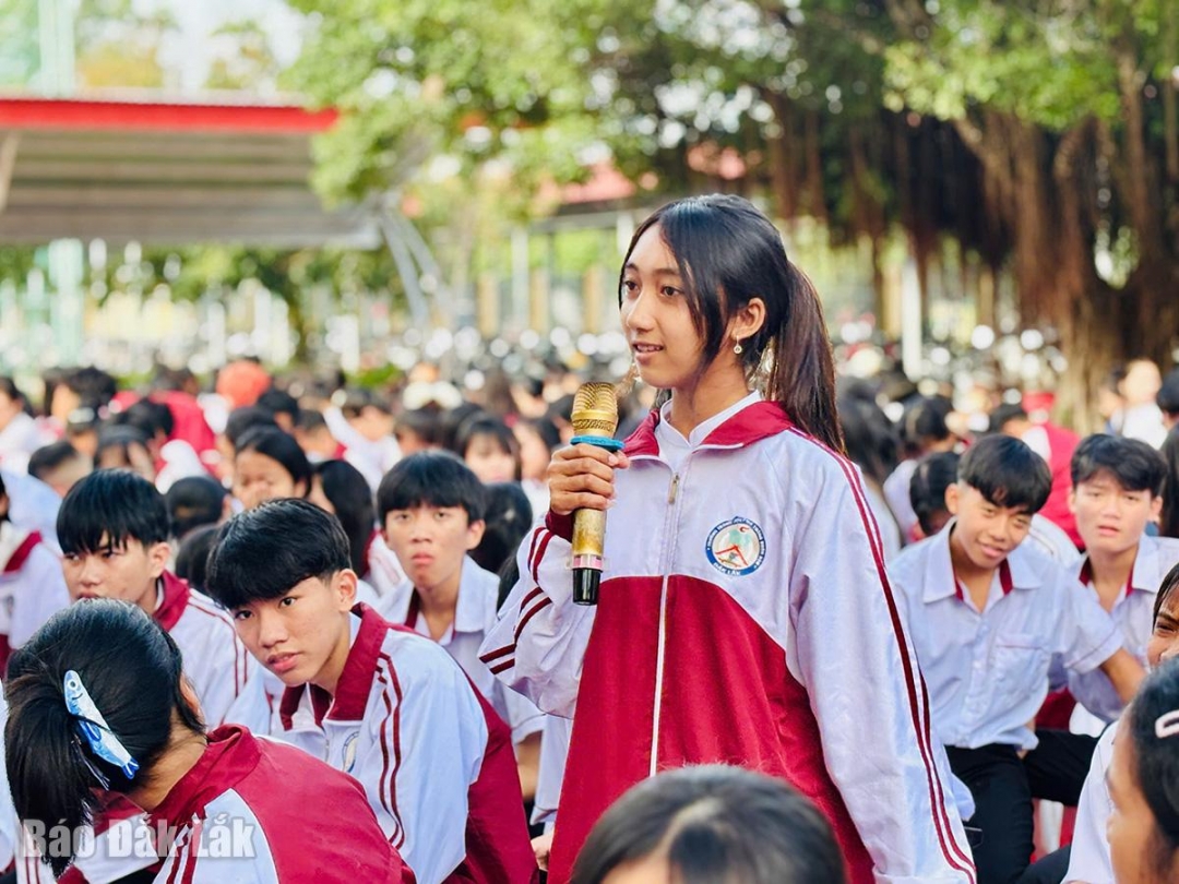 | Học sinh Trường THPT Buôn Đôn tham gia giao lưu tại buổi tuyên truyền phòng, chống bạo lực học đường. |
