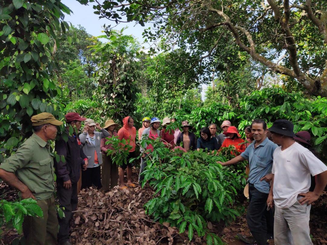 Một buổi tập huấn kỹ thuật do Trạm Khuyến nông TP. Buôn Ma Thuột tổ chức ngay tại rẫy cà phê. |