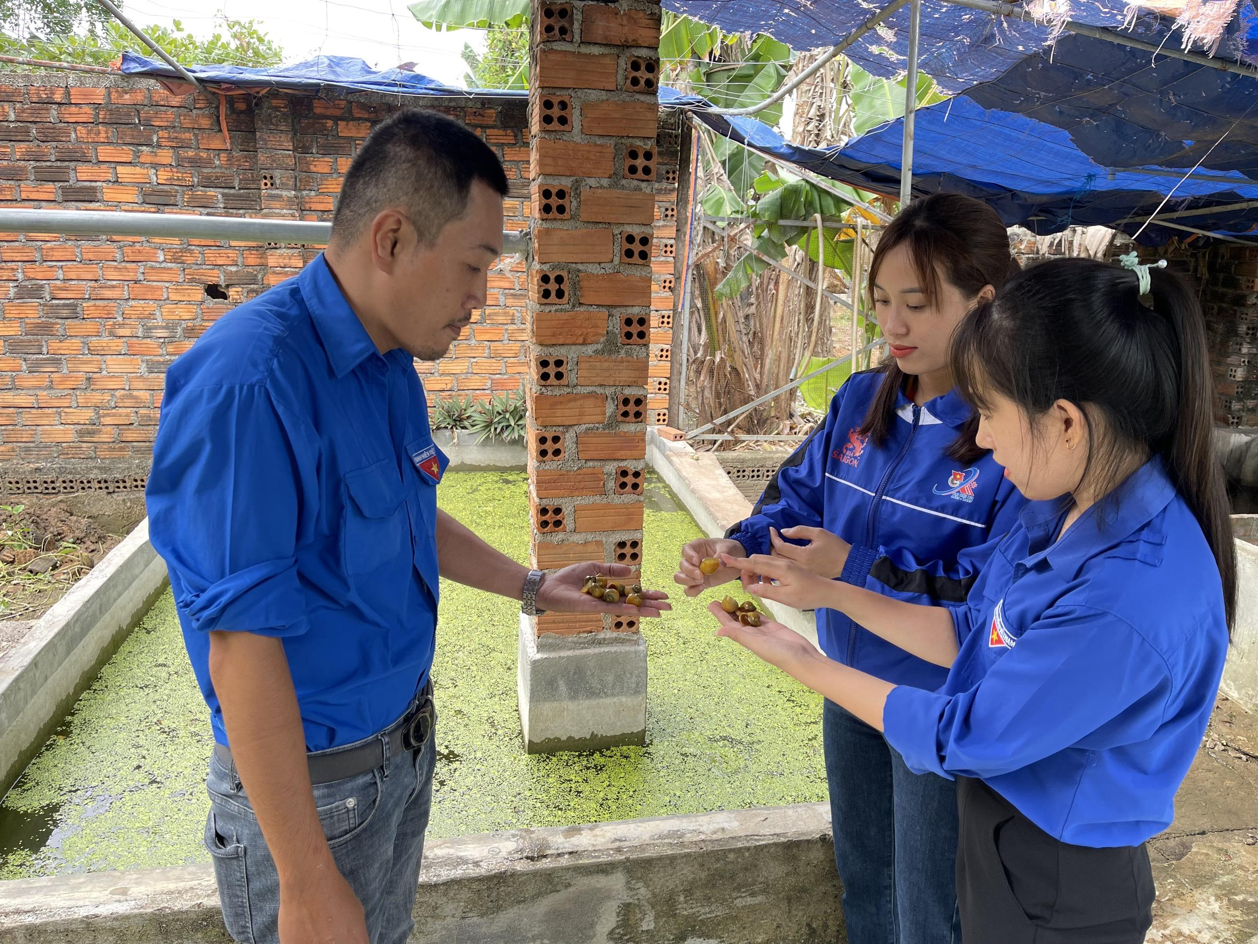 Cán bộ Huyện Đoàn Ea Súp đến tham quan mô hình nuôi cá cảnh và ốc táo của anh Phạm Ngọc Thành. |