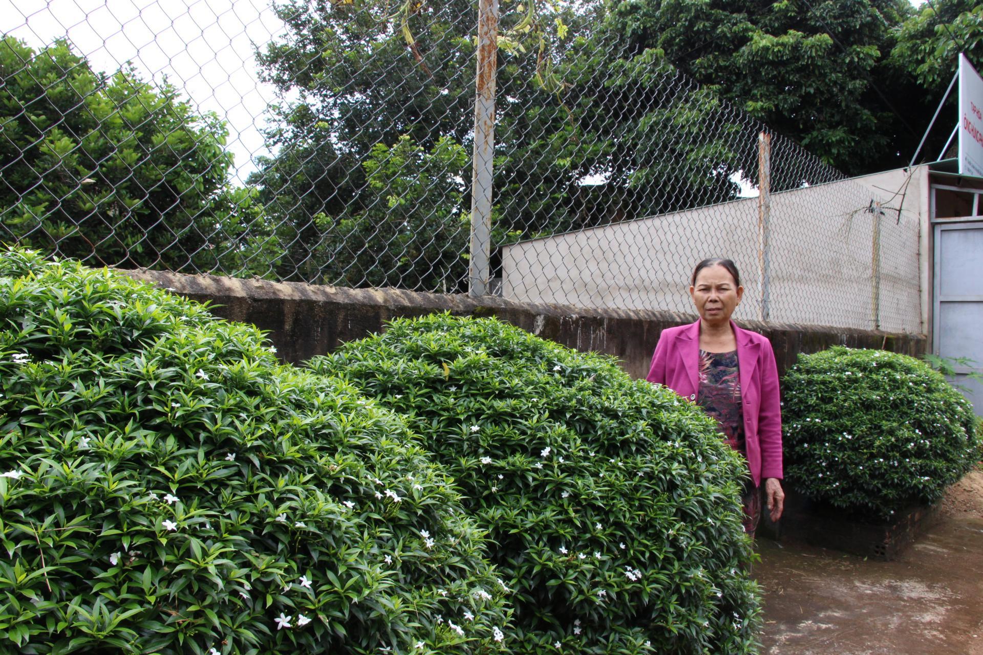 Bà Lê Thị Phấn, thôn Tân Bắc chăm sóc hàng mai vạn phúc trước ngõ gia đình. |