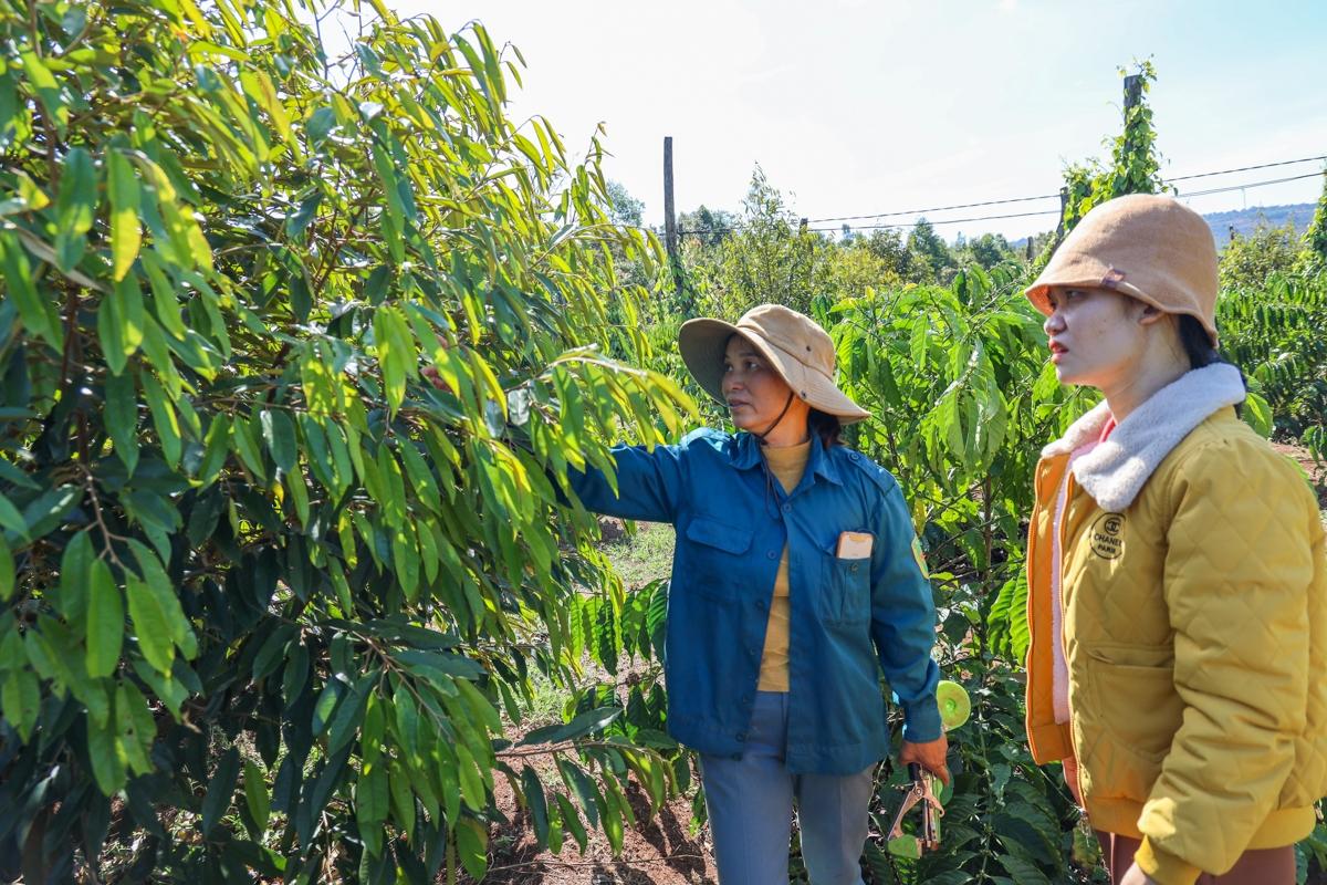 Chị Võ Thị Nhẫn (bên phải) ở thôn 5, xã Ea Khal giới thiệu với cán bộ Hội Liên hiệp Phụ nữ xã về mô hình trồng cà phê xen sầu riêng. |