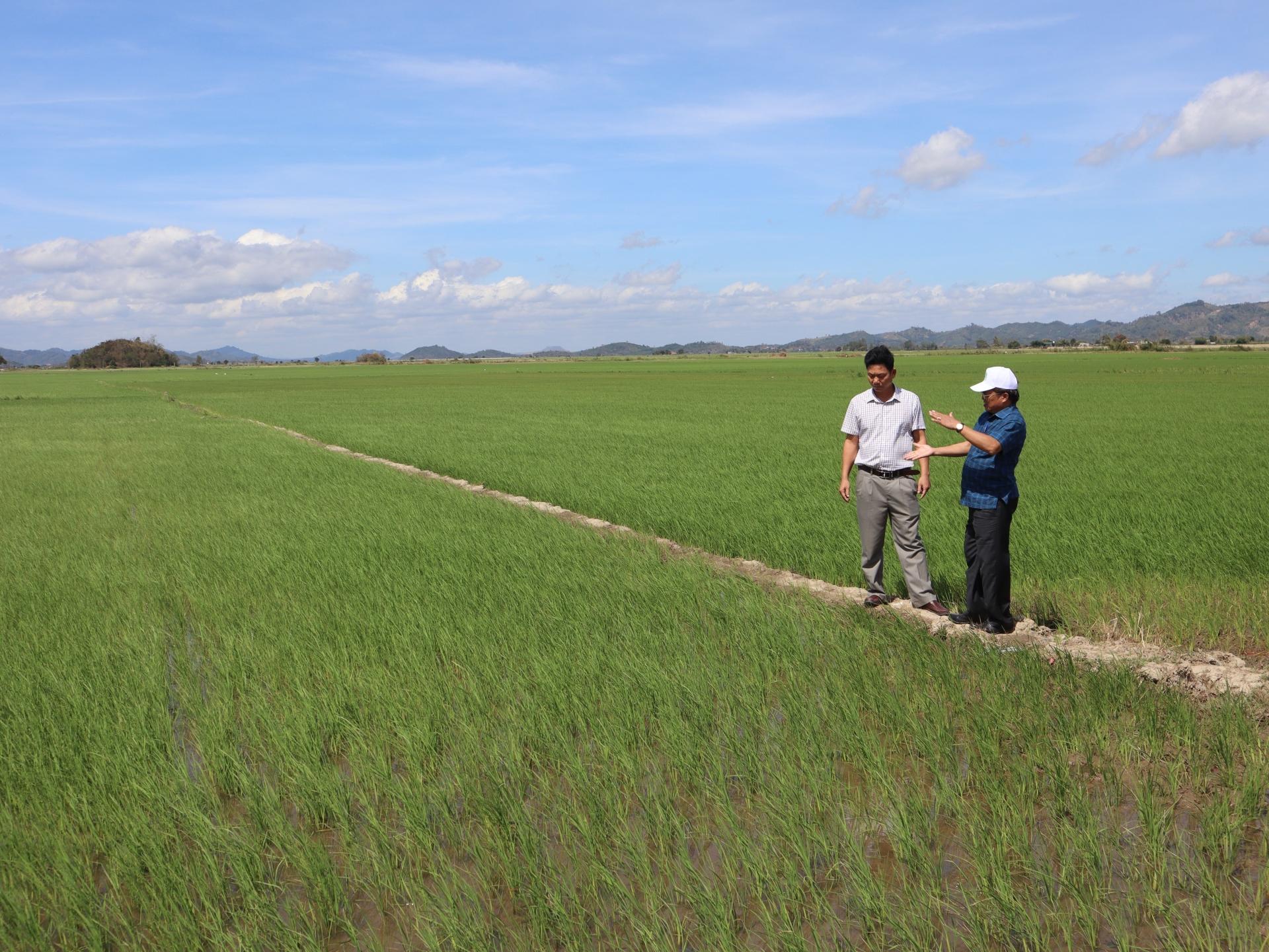Phó Chủ tịch Thường trực UBND huyện Lắk Võ Thành Huệ và lãnh đạo xã Buôn Tría kiểm tra tại cánh đồng thôn Liên Kết 2, xã Buôn Tría. |