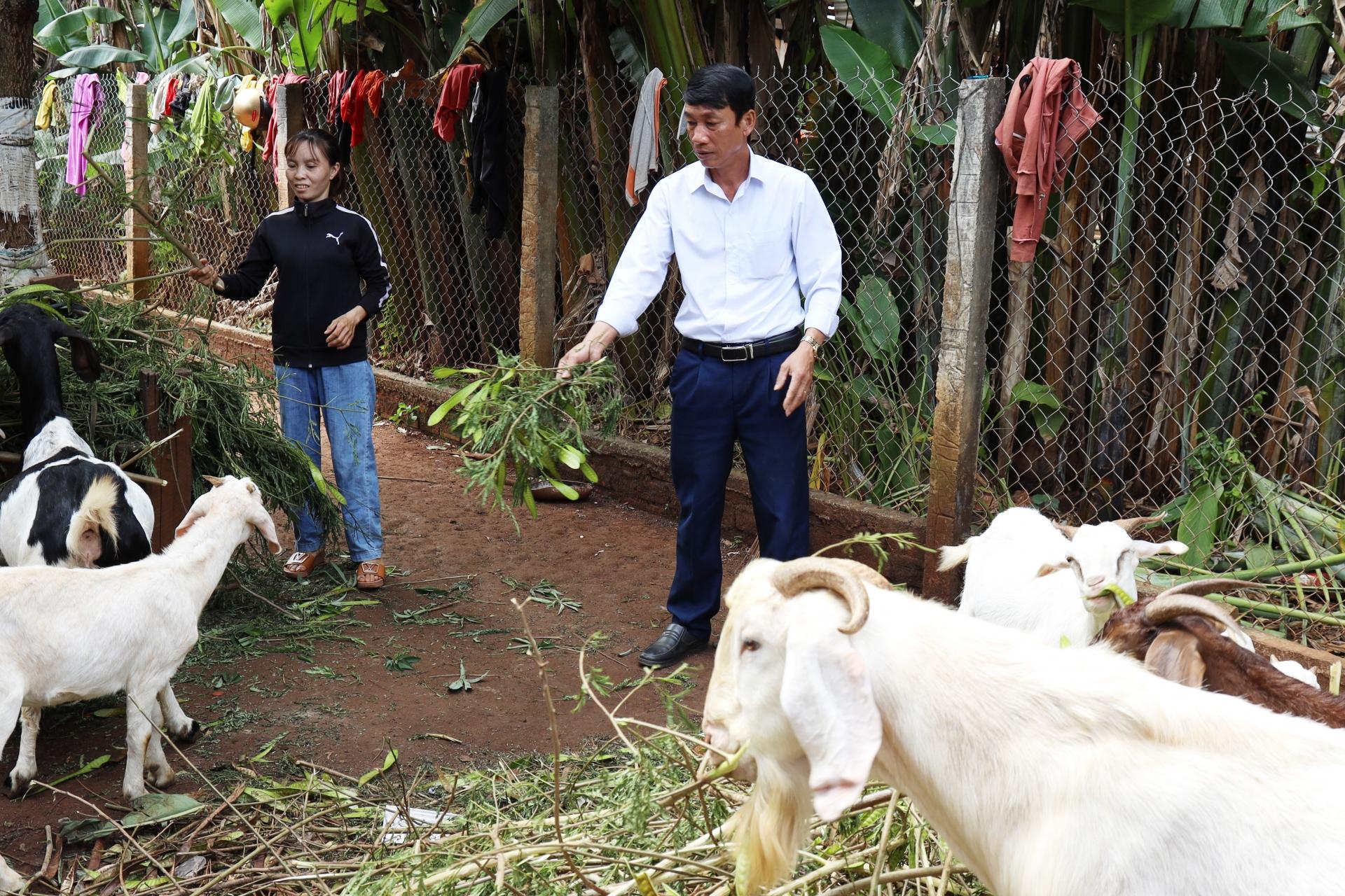 Cán bộ Ủy ban MTTQ Việt Nam xã Quảng Hiệp thăm mô hình chăn nuôi dê của gia đình chị Nguyễn Thị Thu. |