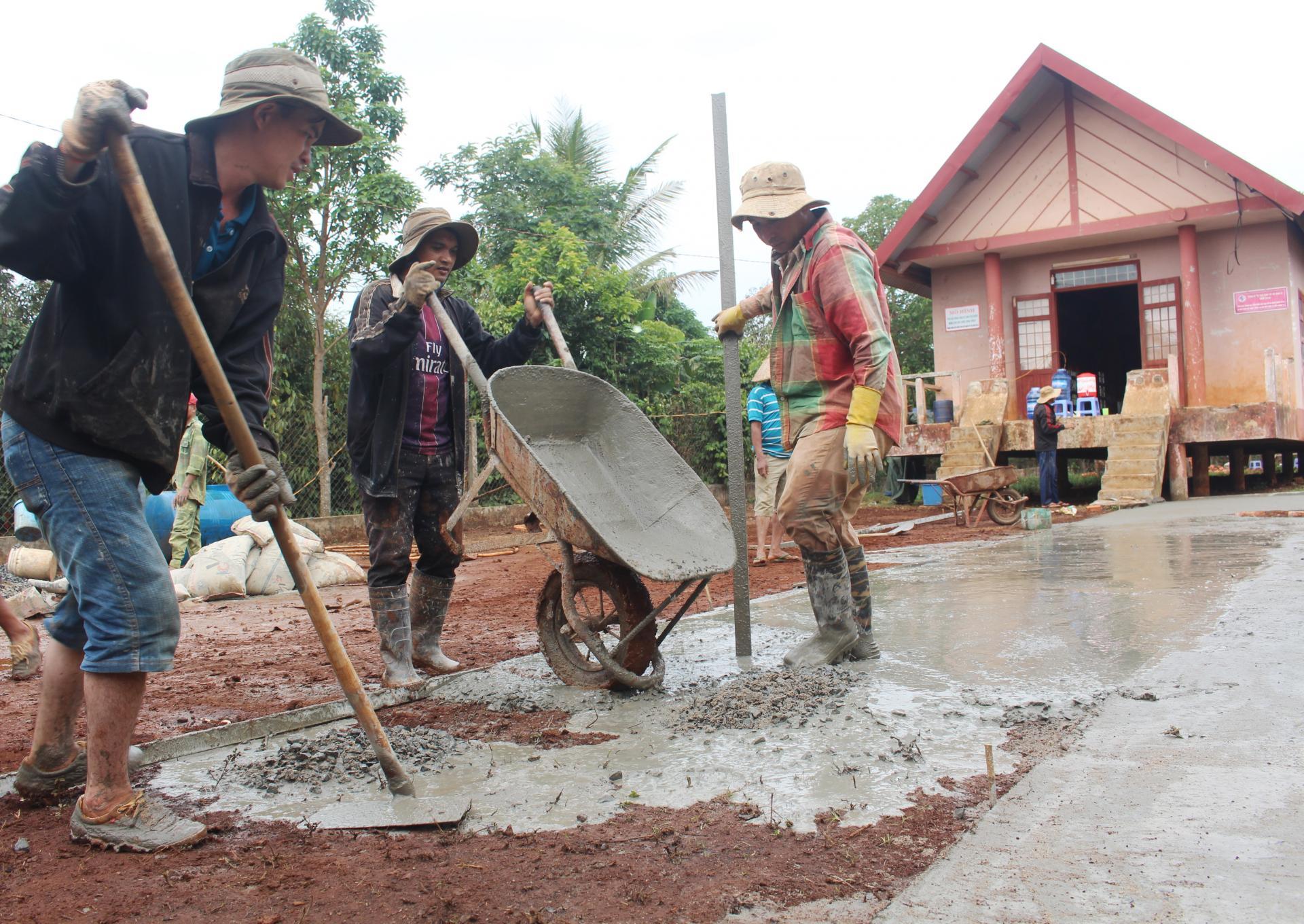 Hội viên nông dân xã Pơng Drang (huyện Krông Búk) đóng góp ngày công làm sân nhà sinh hoạt cộng đồng. |
