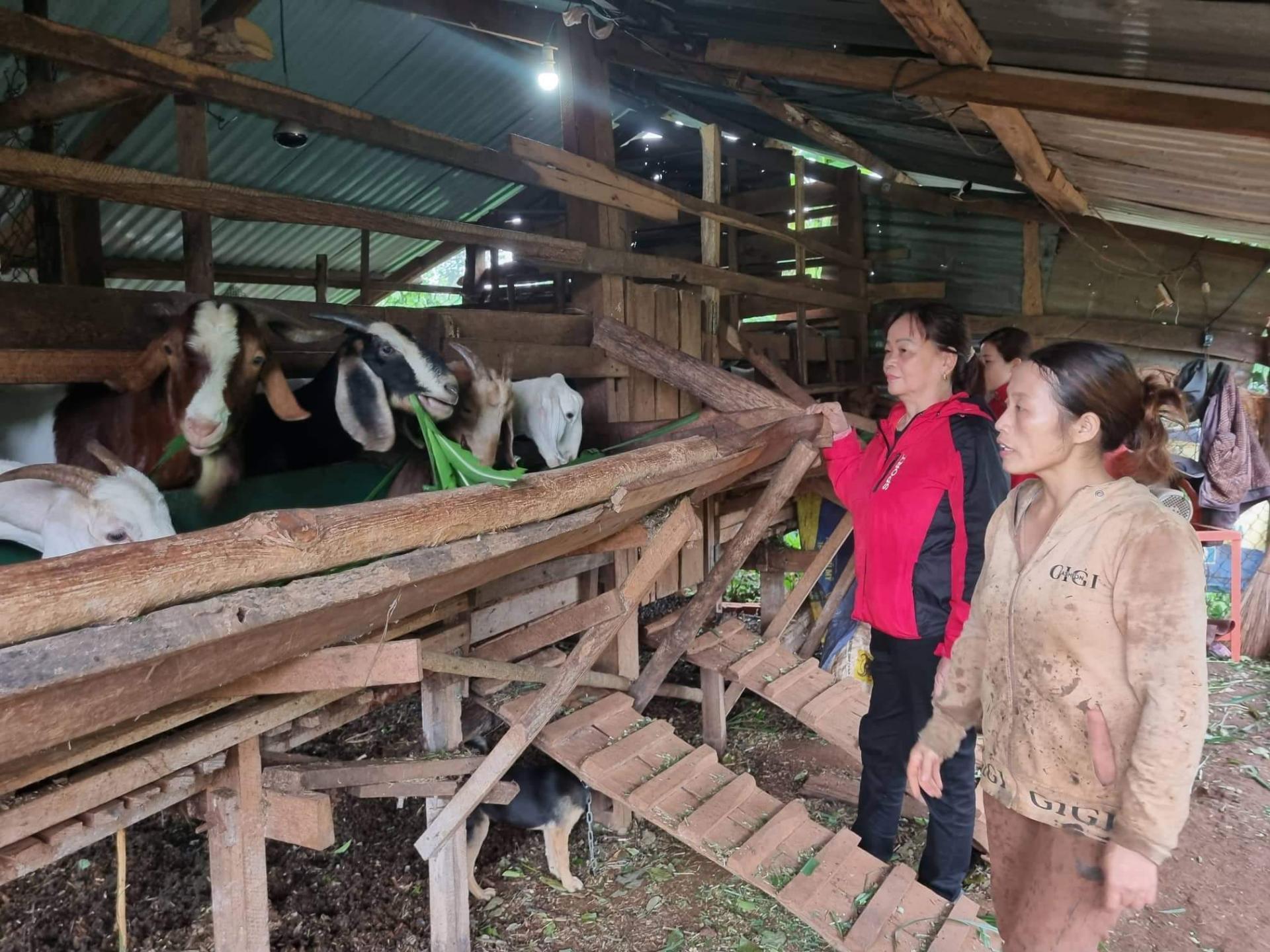 Chị Bùi Thị Thủy (phía ngoài) đang chia sẻ kinh nghiệm chăn nuôi dê của gia đình |