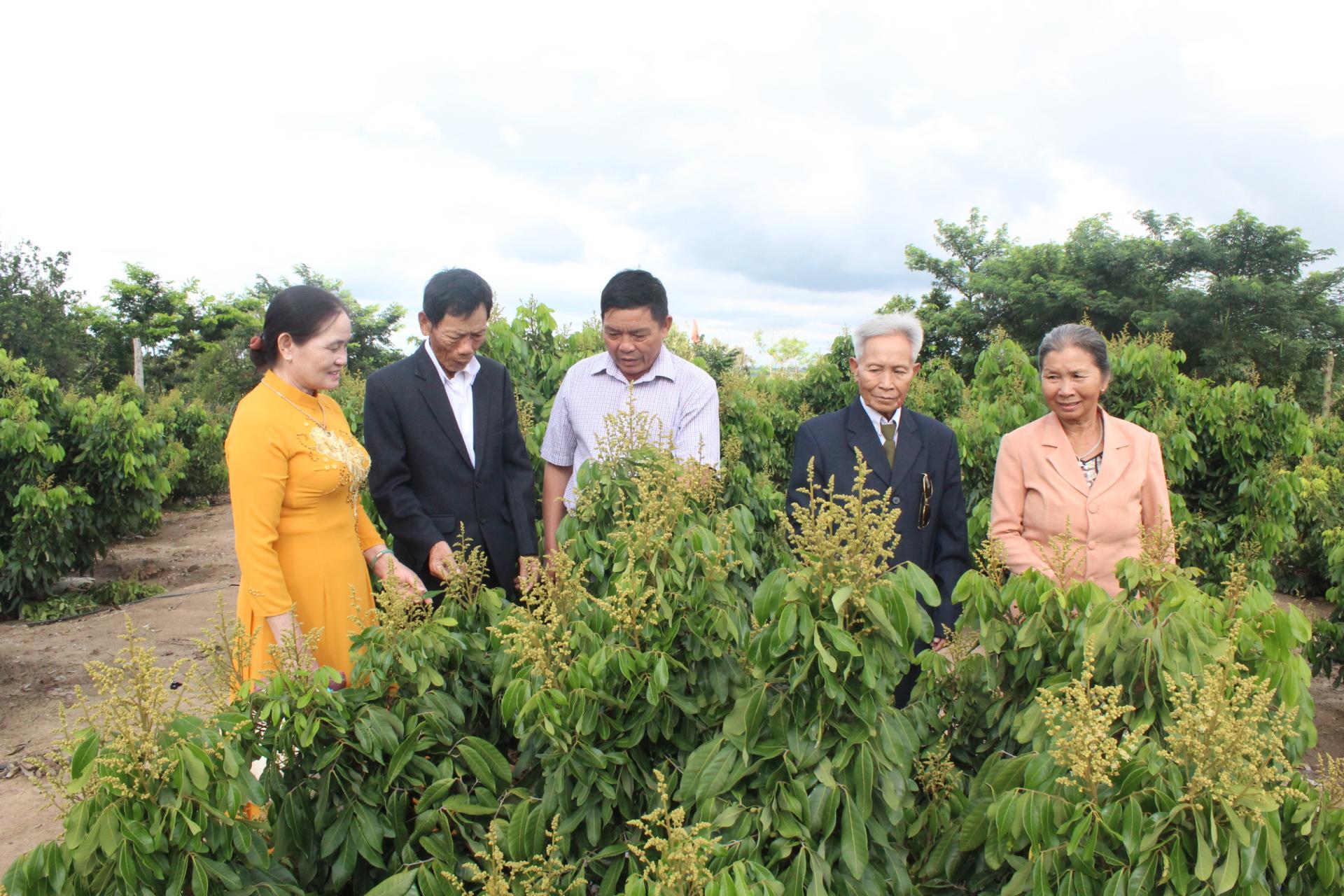 Ông Thêm (thứ hai từ phải sang) đón tiếp đoàn đến tham quan mô hình vườn cây ăn trái của gia đình. |