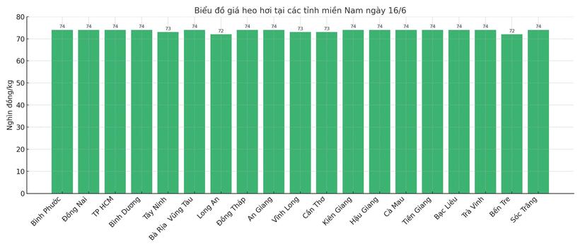Các tỉnh Đồng Nai, Bạc Liêu, Bà Rịa - Vũng Tàu và Cà Mau cũng duy trì mức giá cao 74.000 đồng/kg. Nhìn chung, khu vực miền Nam đang dẫn đầu cả nước về mặt bằng giá, cho thấy sức mua đang có dấu hiệu tăng lên rõ rệt.