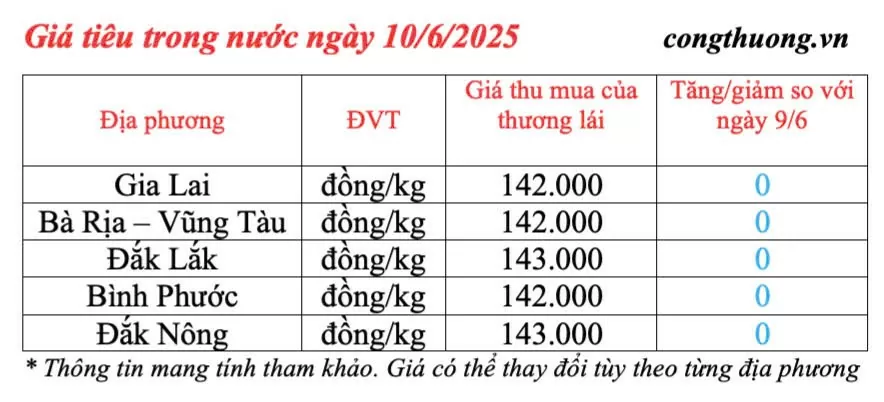 | Giá tiêu trong nước cập nhật sáng ngày 10/6/2025 |