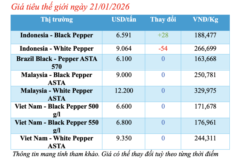Cập nhật giá tiêu thế giới từ Hiệp hội Hồ tiêu Quốc tế (IPC) sáng 21/01/2026, hồ tiêu xuất khẩu hôm nay ghi nhận biến động mới từ thị trường Indonesia. Các thị trường khác duy trì ổn định so với phiên giao dịch hôm qua.