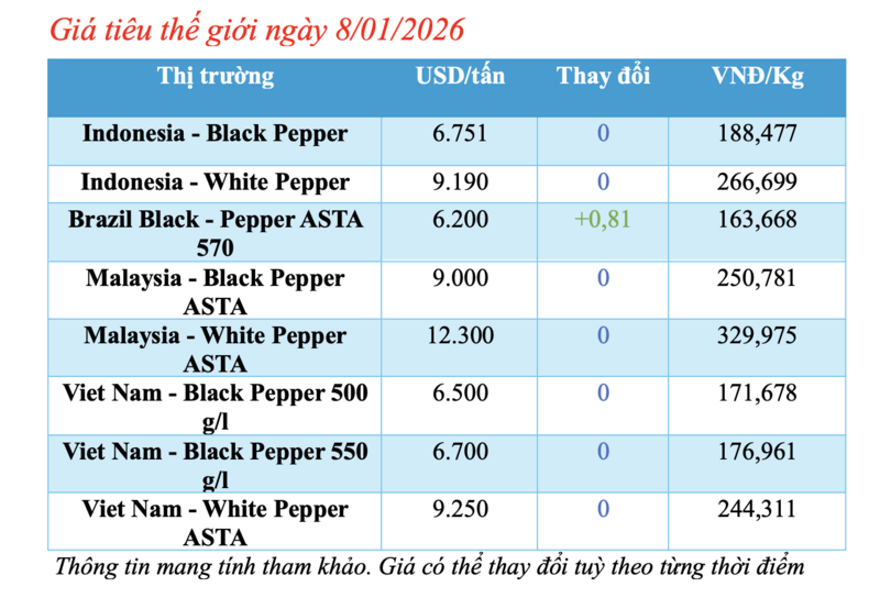 Cập nhật giá tiêu thế giới từ Hiệp hội Hồ tiêu Quốc tế (IPC) sáng 8/01/2026, hồ tiêu xuất khẩu hôm nay ghi nhận biến động mới từ thị trường Brazil. Các thị trường khác đều ổn định giá so với phiên giao dịch hôm qua.