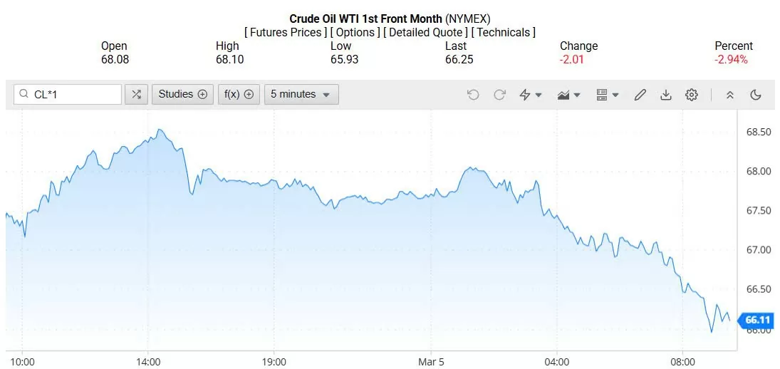 Ghi nhận trên Oilprice lúc 4h ngày 06/03/2025 (theo giờ Việt Nam), giá dầu WTI ở mốc 66,11 USD/thùng, giảm 2,94% (tương đương giảm 2,01 USD/thùng).