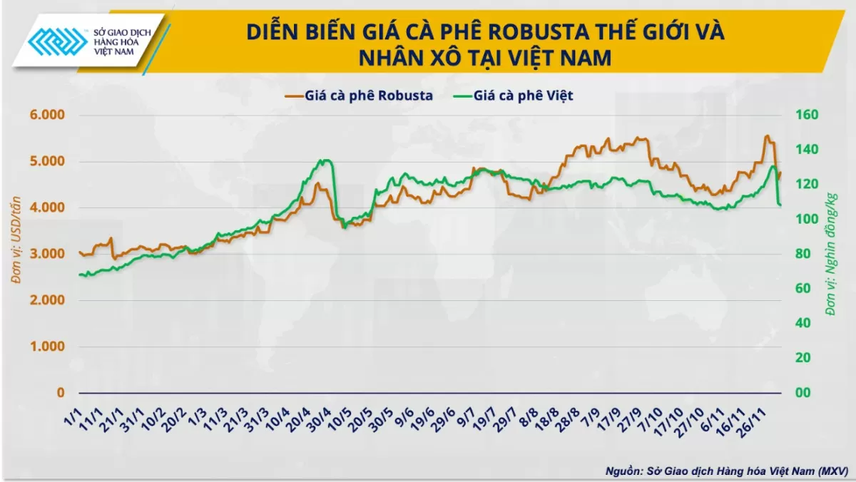 Tháng 11 năm nay, giá cà phê thế giới và trong nước đều ghi nhận làn sóng tăng lịch sử. Theo ghi nhận từ MXV, giá cà phê Robusta trên Sở Giao dịch Liên lục địa châu Âu (ICE-EU) đã phá đỉnh lịch sử cũ, thậm chí có thời điểm đã vượt mốc 5.700 USD/tấn. Tính đến hết phiên giao dịch 30/11, giá cà phê Robusta đã cao gấp đôi so với cùng kỳ năm 2023 và tăng khoảng 30% so với thời điểm đầu tháng. Đồng pha với giá thế giới, giá cà phê nhân xô tại Tây Nguyên và các tỉnh Nam Bộ tính đến ngày 30/11, ở mức 130.000 đồng/kg, cao gấp hơn 2 lần so với cùng kỳ năm trước và ngày càng sát mức đỉnh lịch sử cũ hồi tháng 4, khi dừng tại mức 134.400 đồng/kg.