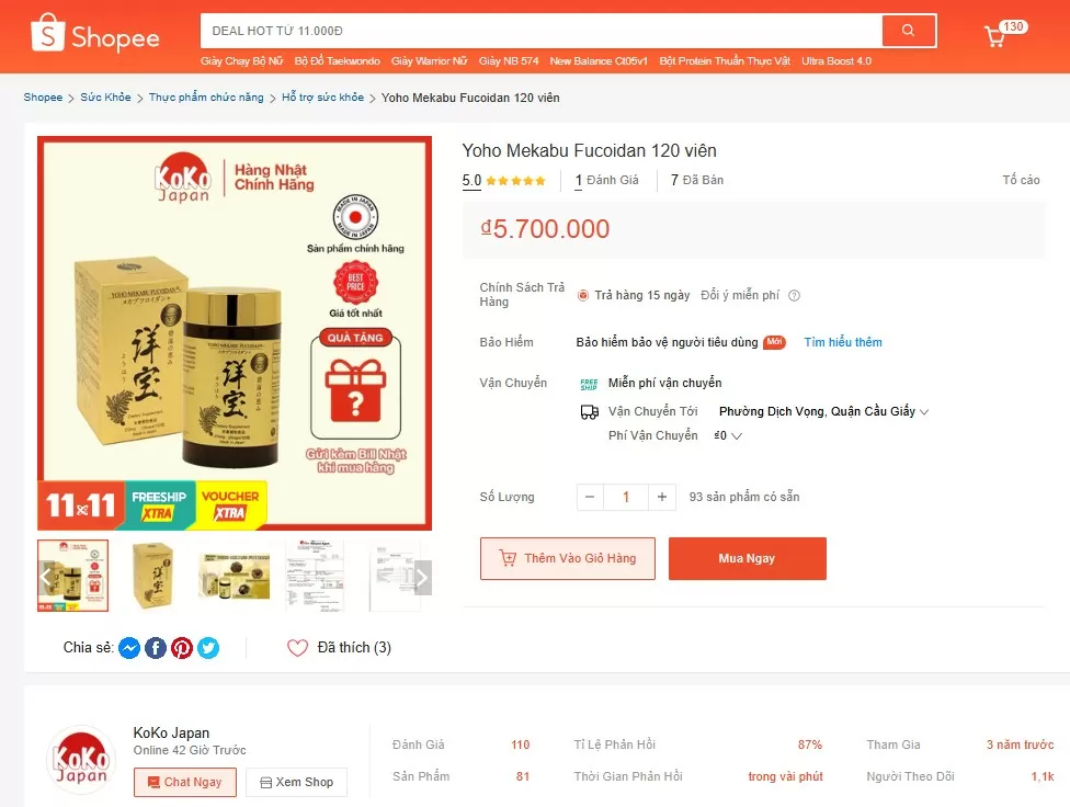 Tại thời điểm đưa ra cảnh báo, sản phẩm Yoho Mekabu Fucoidan 120 viên xuất xứ từ Nhật Bản được rao bán trên Shopee với mức giá 5.700.000 đồng. Ảnh chụp màn hình ngày 1/11 |