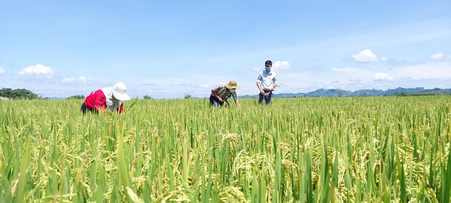 Cán bộ Phòng NN-PTNT huyện Lắk kiểm tra lúa trên cánh đồng của xã Buôn Tría. |