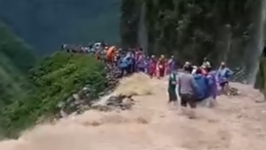 Đoạn video được ghi hình vào sáng ngày 2/10 cho thấy cảnh nước lũ cuồn cuộn chảy trên dòng sông Nho Quế tại khu vực Mèo Vạc, Hà Giang. Clip: Vietnam+/TTXVN