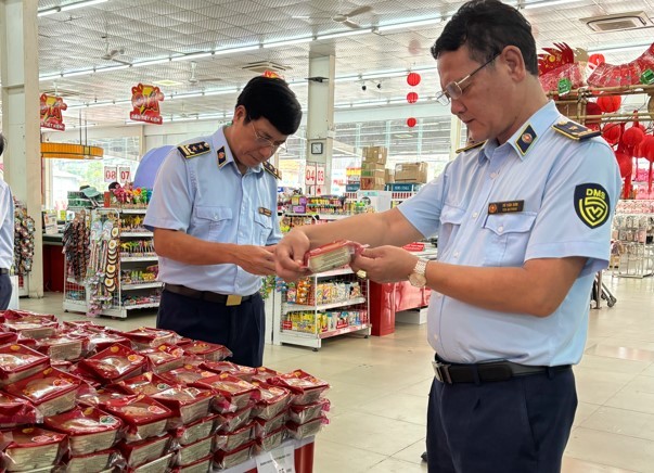 Kiểm tra các sản phẩm bánh kẹo, thực phẩm tươi sống. Ảnh: Cục QLTT Hải Dương |