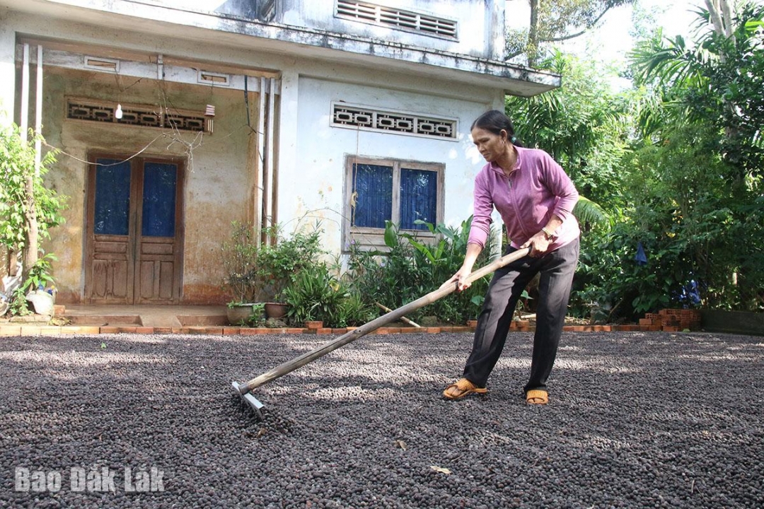 | Bà H’Diet Kpơr ở buôn Ea Mtá (xã Dray Bhăng) phơi cà phê sau thu hoạch. |