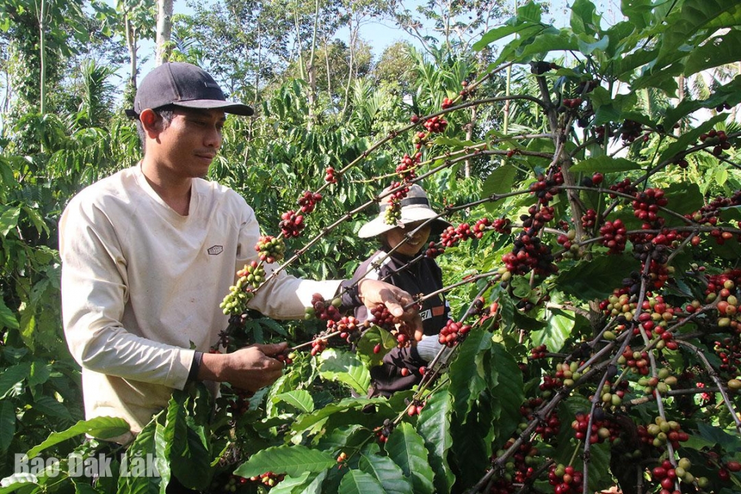 | Anh Y Thih Ksơr ở buôn Ea Bhốk (xã Dray Bhăng) thu hoạch cà phê niên vụ 2025 - 2026. |
