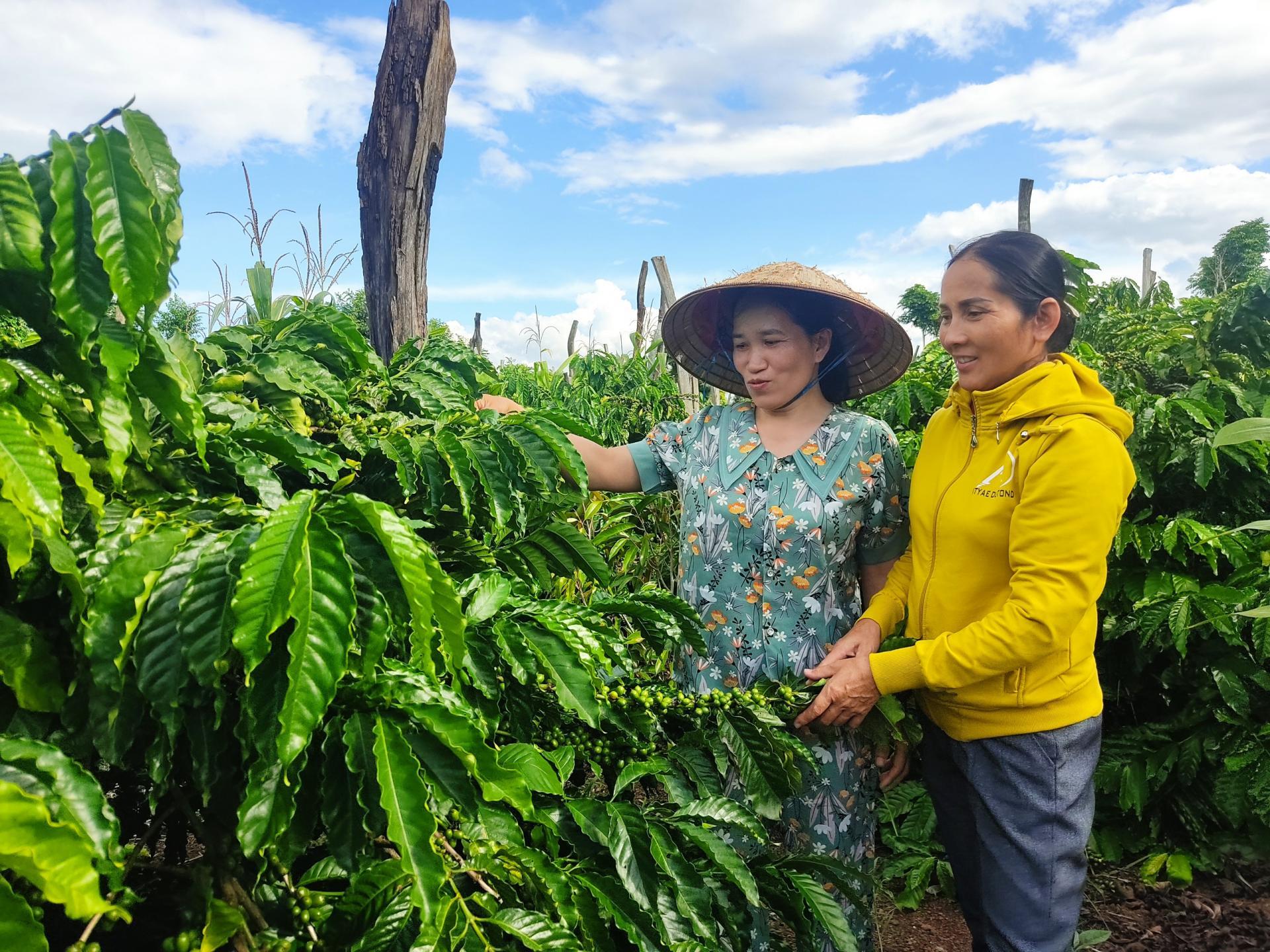 Chị em phụ nữ xã Ea M'nang chia sẻ kinh nghiệm trong chăm sóc cây cà phê. |