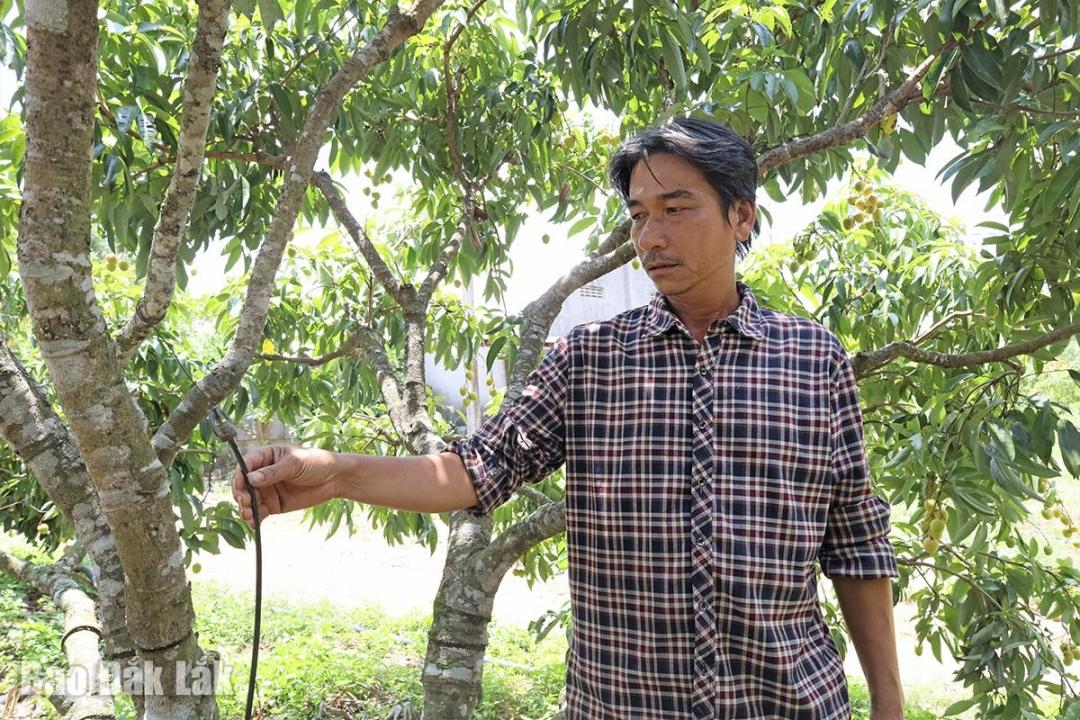 | Nông dân trên địa bàn xã Ea Knốp ứng dụng khoa học kỹ thuật trong quá trình trồng, chăm sóc cây vải. |